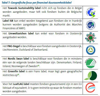 Ten slotte heeft van de vier landen die onder de loep genomen zijn enkel Luxemburg een onafhankelijke organisatie met en financieel duurzaamheidslabel in beheer: de vzw LuxFLAG. Op dit moment zijn er 261 fondsen met een LuxFLAG label.