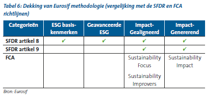 In de studie zijn volumes ook voor het eerst geclassificeerd volgens een methodologie ontwikkeld door Eurosif, de Universiteit van Hamburg, de Sustainable Finance Research Group en Advanced Impact Research (AIR). De methodologie dient in eerste instantie om marktstudies over duurzame investeringen op Europees niveau te standaardiseren, en niet als voorstel voor integratie in wettelijke kaders. Beleggingen met ESG-basiskenmerken moeten bindende exclusies of positieve screening hebben, ‘geavanceerde ESG beleggingen’ beide, én er is een 20% reductie van het beleggingsuniversum nodig. Voor ‘impact-gealigneerde beleggingen’ moeten investeringen gealigneerd zijn met een algemeen erkende positieve impact categorie die kan worden gemeten, terwijl voor ‘impact-genererende’ beleggingen aantoonbare impact nodig is, en een actief aandeelhouderschap van de investeerder45. In onderstaande tabel van Eurosif wordt duidelijk hoe de methodologie zowel de categorieën van de SFDR en de Britse Financial Conduct Authority (FCA – zie ook de uitleg over de SDR) in rekening neemt.