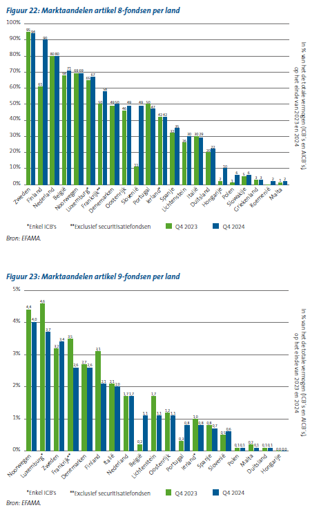 2024 werd gekenmerkt door een netto uitstroom uit artikel 9-fondsen in Europa, van 365 naar 353 miljard euro. Dit vertegenwoordigt 2% van het totaal volume ICB´s en AICB´s in de studie. De daling komt deels door een voorzichtige interpretatie van een verduidelijking door ESMA uit 2022, waarin staat dat 100% van artikel 9-fondsen moet worden belegd met een duurzame doelstelling. Bovendien desinvesteerden beleggers in 2023 en 2024 van actieve aandelenfondsen, terwijl het netto vermogen in artikel 9-fondsen juist wordt gedomineerd door actief beheer, in tegenstelling tot passieve ETF’s. Onderstaande grafieken tonen het percentage artikel 8 en artikel 9-fondsen per land. Dit toont dat adoptie het hoogste is in de Scandinavische landen, de Benelux en Frankrijk. EFAMA geeft aan dat ondanks de lage adoptie in de Centrale Europese landen, het percentage in deze landen wel is gestegen in 2024.